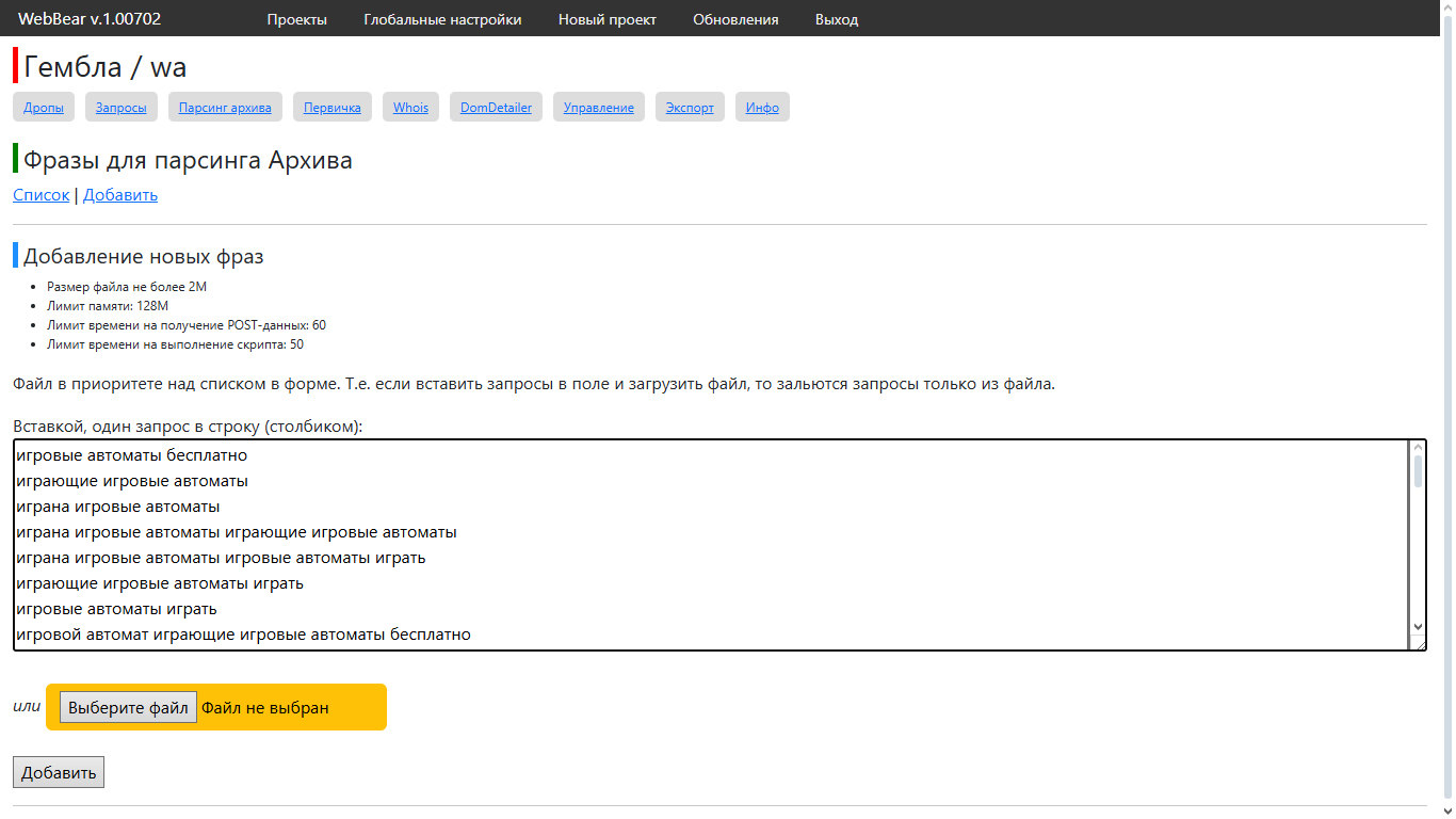Загружается список ключей, по ним парсится выдача Архива, после выявляются дропы.